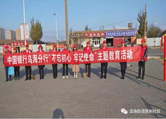 为深入推进“不忘初心,牢记使命”主题教育,进一步服务社区居民,倡导文明行为,给居民一个良好的生活环境,11月6日,胜利社区联合包联单位中国银行乌海分行共同开展了“不忘初心 牢记使命”主题教育志愿服务活动。