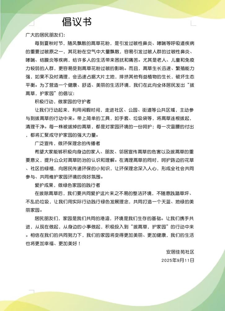 社区党委高度重视此次专项行动,依托”精网微格”治理体系,在活动前期进行了周密部署。通过发布《“拔蒿草,护家园”倡议书》,详细阐述蒿草对居民健康的危害性和清理工作的重要性,号召广大居民以实际行动感恩党的关怀,共建美好家园。倡议书通过微网格微信群、楼栋长上门等方式广泛传播,引发了居民热烈反响。同时,社区建立“社区-物业-楼栋长-志愿者”四级联动机制,明确分工职责,确保行动有序开展。