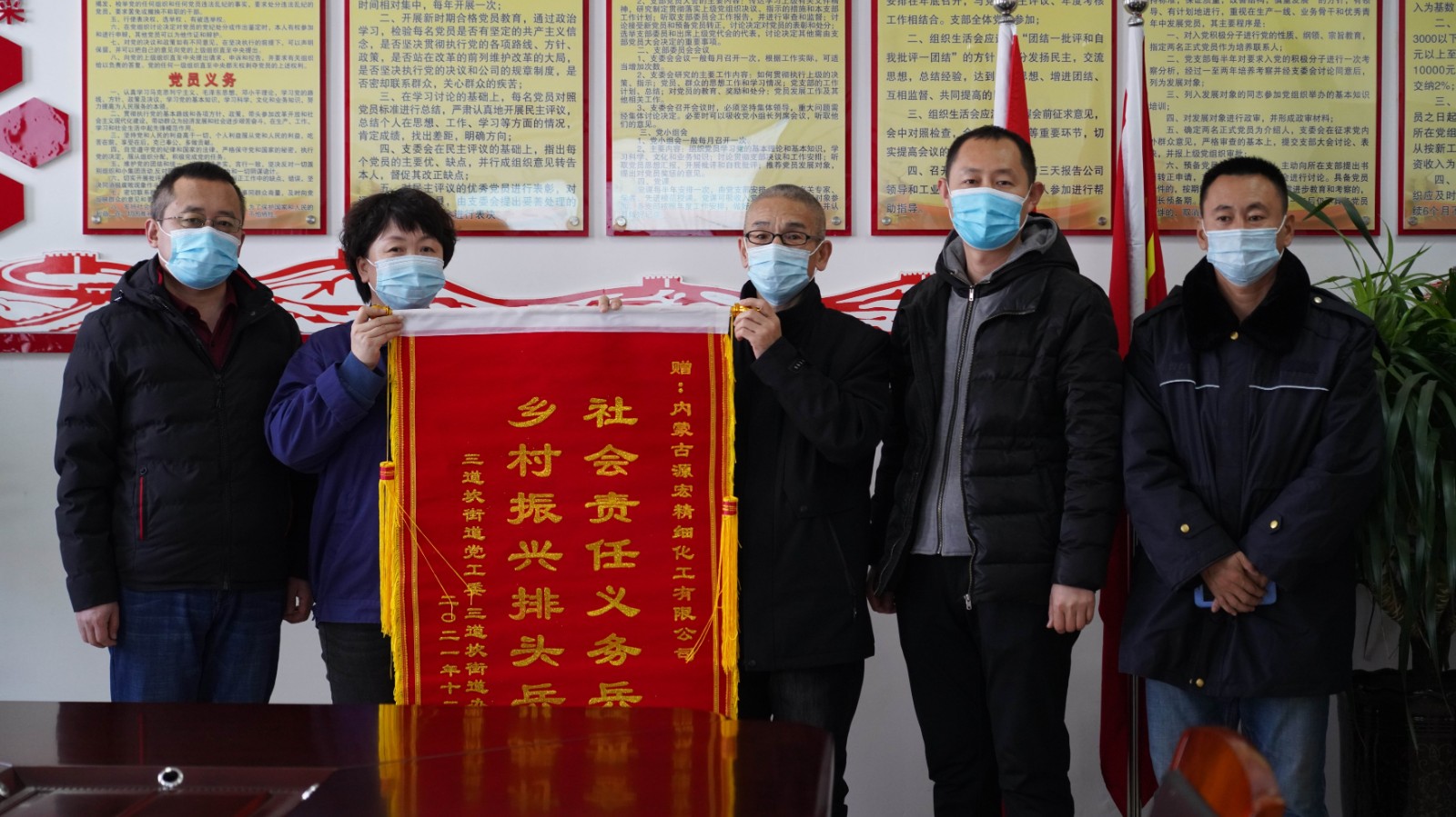 12月21日上午,三道坎街道党工委、园区管委会、胡杨社区驻村队一行将印有“社会责任义务兵 乡村振兴排头兵”的锦旗送到内蒙古源宏精细化工有限公司、内蒙古英莱新材料有限责任公司等园区企业中,感谢他们助力三道坎农产品销售,带动群众增收致富。
