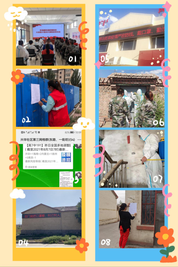 织密“组织网”,筑牢防疫“硬堡垒”。连日来,走在四化村的大街小巷,总能看见“红马甲”身影穿梭其中。“您好,我们是苏海图街道的志愿者,这份是《乌达区最新疫情防控通知》,麻烦您看看。最近出门要记得戴上口罩,还要勤洗手、多通风。”由社区“两委”人员、居民党员、民兵党员30人组成的党员突击队,以党支部为“圆点”,以党员先锋为“支柱”,在辖区范围内开展中高风险地区往返人员摸底排查工作,认真落实核酸检测、隔离管控、健康监测等防控措施,进一步织密防疫网络,成为战疫一线有力的“红色卫士”。