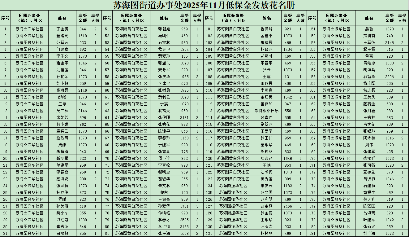 上一篇:苏海图街道办事处2025年11月最低生活保障金变更表