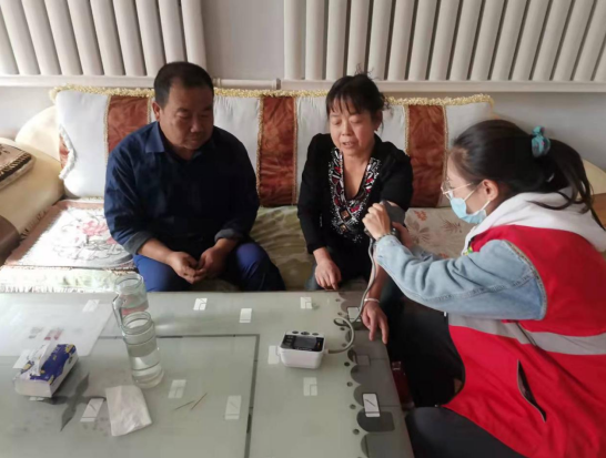 志愿者到老人家里为老人耐心细致的测量着血压,热心询问老人日常的用药情况和身体健康状况等一系列问题,并且嘱咐老年朋友们在日常生活中要经常关注自己的身体健康,平时注意少盐清淡饮食,适量运动。