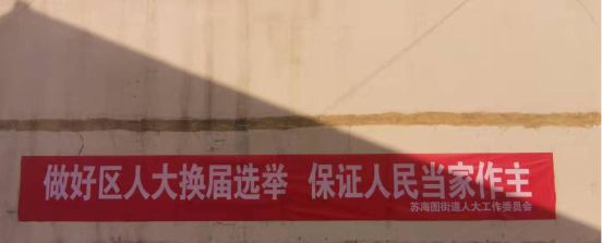 通过悬挂宣传横幅,向居民群众宣传人大换届选举知识和选举政策,积极营造浓厚的选举氛围,充分调动居民参加选举的积极性,正确引导选民行使知情权和选举权。