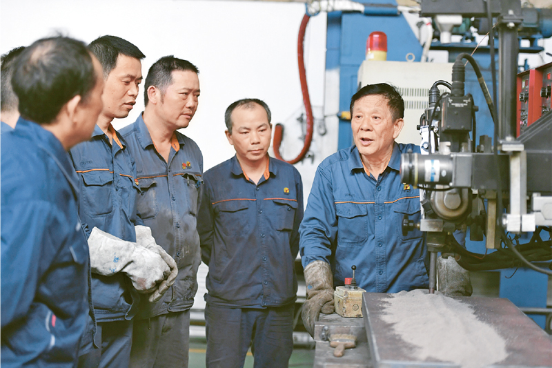 在新时代实现广大职工对美好生活的向往,必须认真贯彻尊重劳动、尊重知识、尊重人才、尊重创造方针,提升广大职工创新创造活力,培养造就更多高技能人才和大国工匠。图为2021年6月12日,“七一勋章”获得者、大国工匠艾爱国(右一)在湖南华菱湘潭钢铁有限公司实验室和同事探讨焊接技术。 新华社记者 薛宇舸/摄