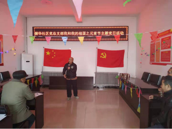 2019年是中华人民共和国成立70周年。为了营造良好的文化氛围,丰富辖区居民的精神文化生活,引导广大群众在积极参与体验节日习俗、展现中国精神、增进文化自信,焕发出爱党爱国爱社会主义的巨大热情。2月25日苏海图街道办事处振华社区党总支部在办事处活动室开展“我和我的祖国之元宵节主题党日”活动,来自社区的20多名党员参加活动。
