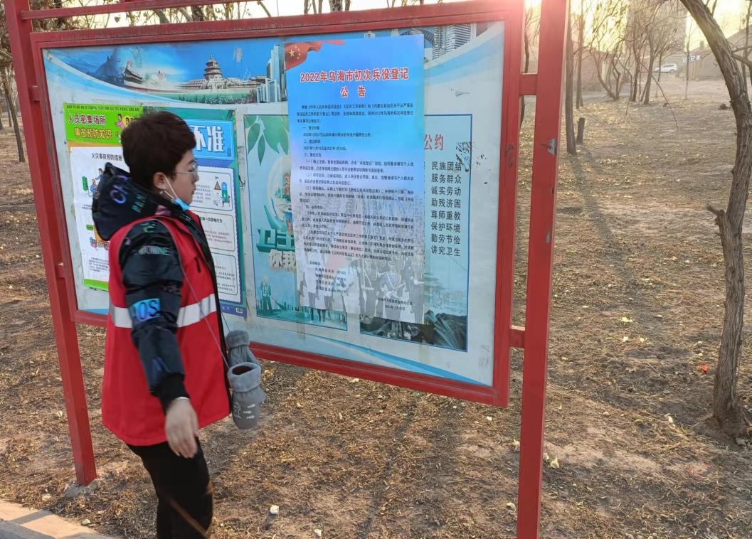 社区工作人员通过在辖区宣传栏张贴《2022年乌海市初次兵役登记公告》的宣传海报、在社区小广场发放征兵宣传单,在居民网格群、微信公众号发布通知等形式向辖区居民广泛宣传征兵信息。兵役登记时间截止至2022年1月10日。