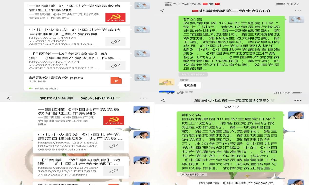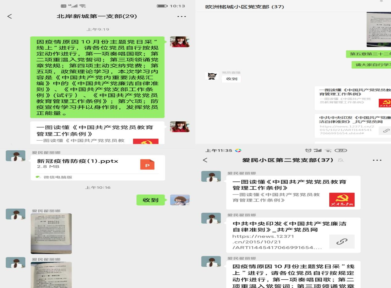在疫情防控的特殊时期,爱民佳苑社区党委结合实际,下发了10月份主题党日活动安排,动员下设的5个党支部充分利用微信群、QQ群、网络视频会议等平台,开展“线上”主题党日活动。