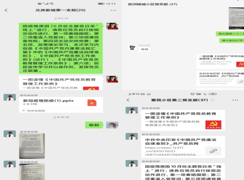 “各位党员,疫情期间我们开展线上学习,学习资料已分享至本群,请大家认真学习。”疫情期间,爱民佳苑社区各党支部始终坚持抓好党员日常教育管理不放松,积极开展“线上”学习,为战“疫”中的主题党日增添一抹亮色。党员们自行按照规定动作完成主题党日流程,各支部组织党员学习了《中国共产党党内重要法规汇编》中的《中国共产党廉洁自律条例》、《中国共产党支部工作条例》、《中国共产党党员教育管理工作条例》,随后还观看防疫宣传片,进一步激发党员干部勇于担当、迎难而上、甘于奉献的精神。