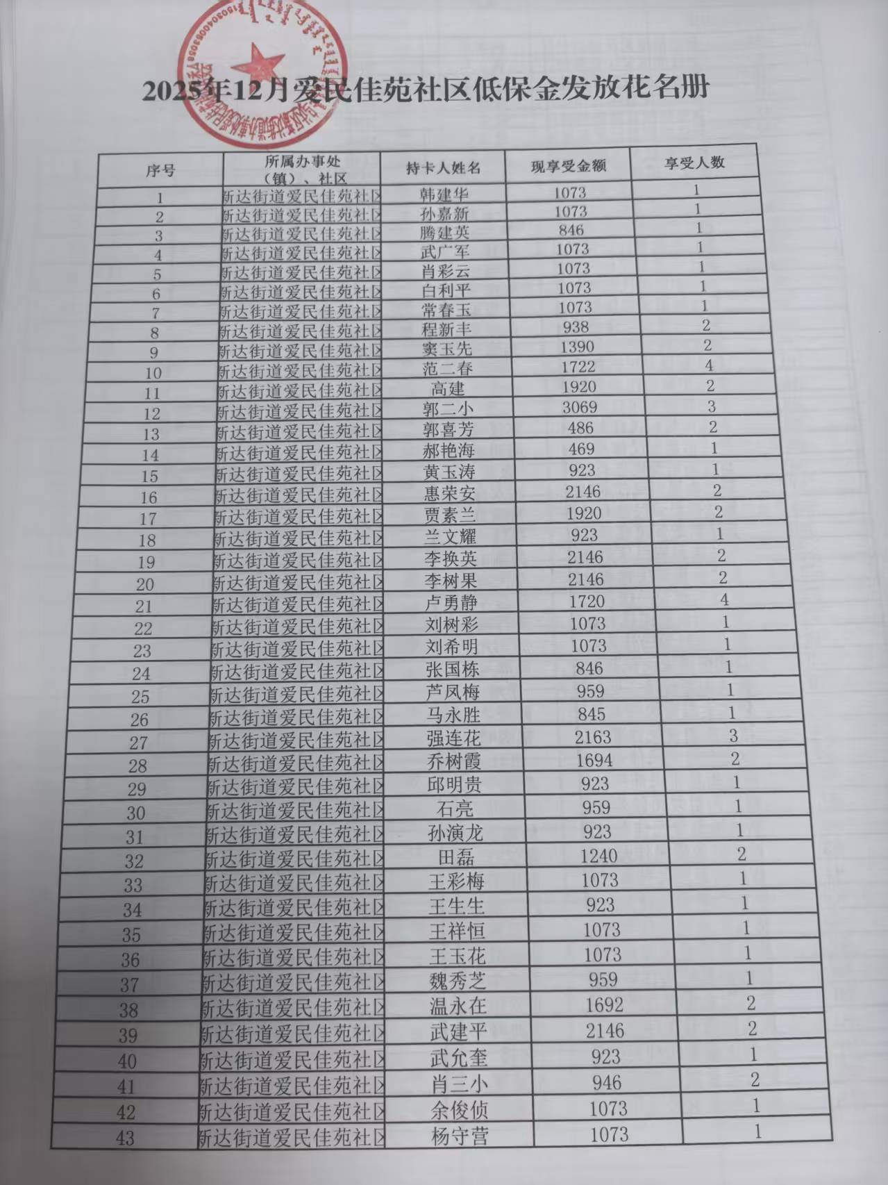 下一篇:【居务公开】2025年12月爱民佳苑社区残疾低保对象生活补贴发放花名公示