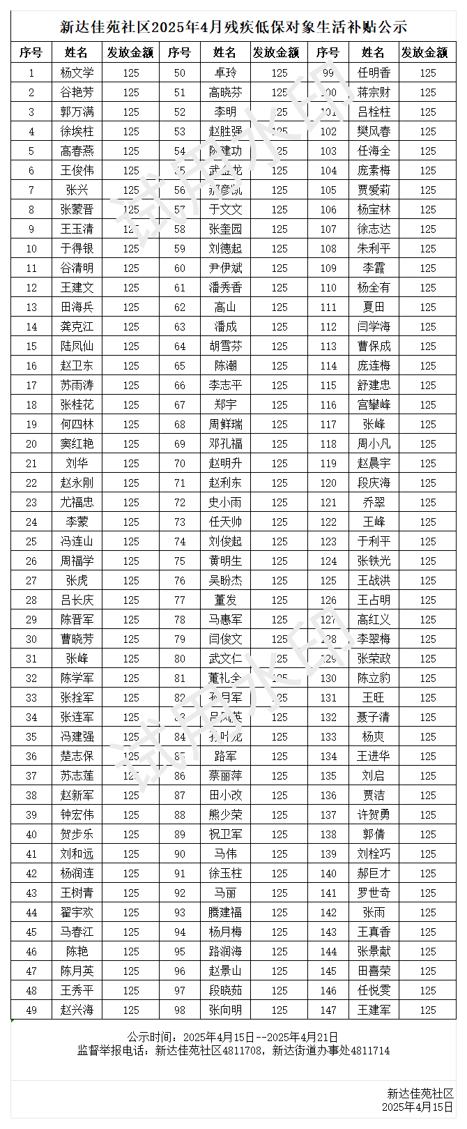 上一篇:【居务公开】新达佳苑社区2025年4月重度一二级护理补贴公示