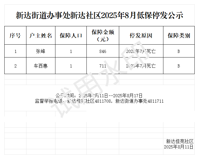 上一篇:【居务公开】2025年8月新达街道办事处新达社区低保金发放花名册公示