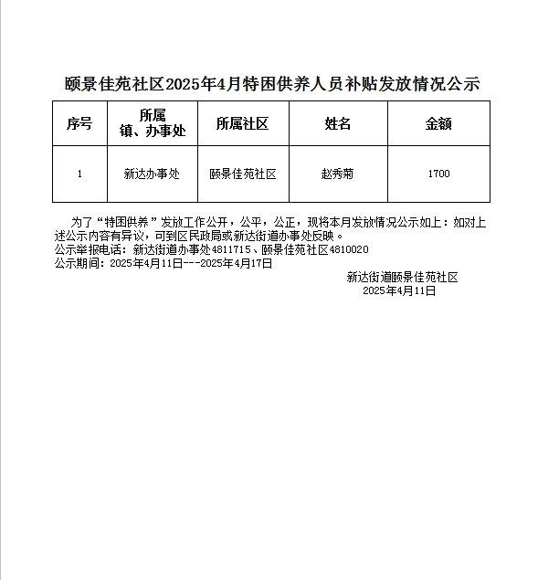 下一篇:【居务公开】颐景佳苑社区2025年4月困难残疾人生活补贴发放情况公示