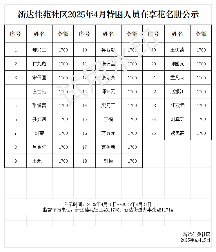 下一篇:【居务公开】新达佳苑社区2025年4月低保金发放情况公示
