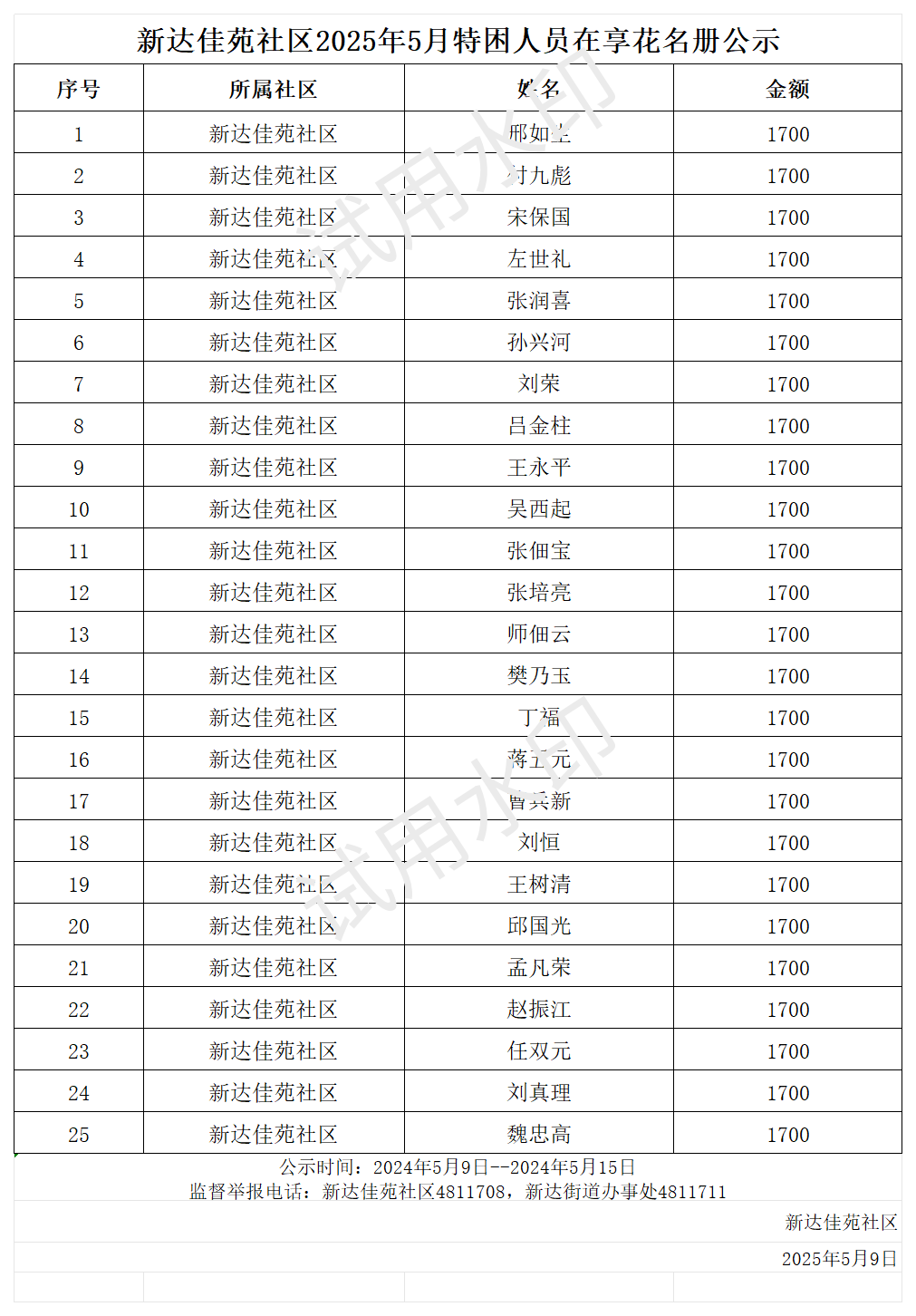 下一篇:【居务公开】新达佳苑社区2025年5月低保金发放情况公示